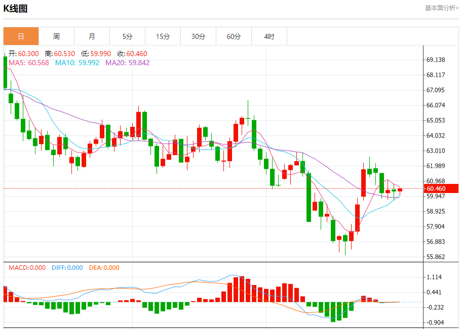 原油市场:截止北京时间20:23,美油下跌,现报60.460,跌幅0.18%。纽市盘前,原油价格在最后一个交易日小幅下跌,继续试图寻找看涨动力以恢复其看涨轨道,价格在EMA50上方保持稳定,形成关键的动态支撑,帮助其在当前下跌的情况下保持看涨走势。