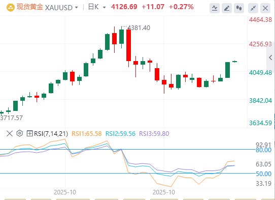 周二亚盘,黄金徘徊在4126.69附近。由于美联储(Fed)在12月降息和美元(USD)疲软的前景下,贵金属在前一交易日触及两周高点后小幅走高。周二晚些时候,美国ADP就业变化周报将成为人们关注的焦点。上周私人就业和消费者报告均显示出经济放缓迹象后,市场对美国下个月降息的预期增加支撑了黄金的上涨。根据CMEFedWatch工具,目前市场预计美联储在12月降息25个基点(bps)的可能性接近67%,到1月份降息的可能性将上升至80%左右。较低的利率可能会降低持有黄金的机会成本,从而支撑无收益贵金属。