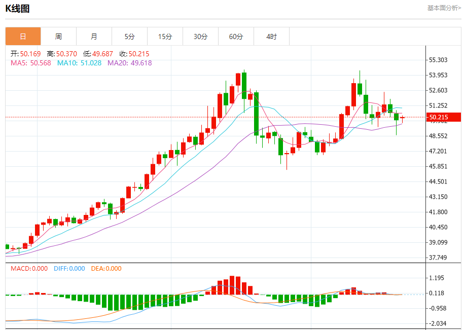 现货白银:截止北京时间21:20,现货白银上涨,现报50.212,涨幅0.51%。纽市盘前,(白银)价格在最后一个交易日小心上涨,再次测试50.25美元阻力,因其交易低于EMA50而继续承受负面压力,相对强度指标上出现负面重叠信号,与价格走势相比达到夸张的超买水平,受之前在短期基础上打破次要看涨趋势线的影响。