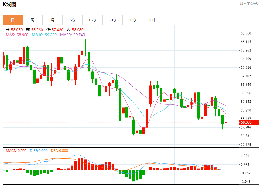 原油市场:截止北京时间21:20,美油上涨,现报58.090,涨幅0.05%。纽市盘前,在最近的盘中交易中,(原油)价格下跌,原因是在关键阻力位58.00美元保持稳定的同时,由于其交易价格低于EMA50,负面压力持续存在。在主要下行趋势占主导且价格沿趋势线波动的背景下,其相对强弱指标已释放超卖条件。
