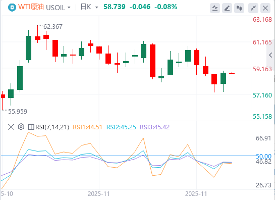 周二亚盘,原油交投58.73附近。市场对美联储可能于12月降息的预期提振了风险资产,同时投资者对俄罗斯能否顺利达成推动其石油出口的乌克兰和平协议持谨慎态度限制了油价的跌幅,市场正密切关注即将公布的美国经济数据,以及俄乌和谈的进一步进展,这些因素将继续主导短期油价走势。