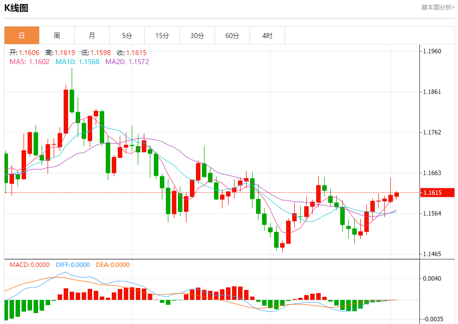 欧元/美元:截止北京时间21:20,欧元/美元上涨,现报1.1616,涨幅0.05%。纽市盘前,(欧元兑美元)的价格在最后一个交易日下跌,因为它试图寻找上涨的低点,以此作为基础,可能有助于它获得复苏所需的看涨动力,因为它在短期基础上在看涨修正通道范围内交易,并且由于它在EMA50上方交易,存在明显的正面压力,与价格走势相比被夸大,表明形成正背离。