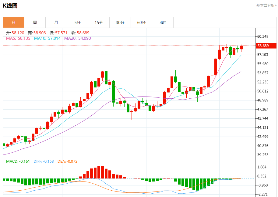 原油市场:截止北京时间21:20,美油下跌,现报58.800,跌幅0.10%。纽市盘前,(原油)价格在最后一个交易日上涨,以弥补之前的一些损失,并试图在相对强度指标上卸载一些明显的超卖条件,受短期负面技术形态(上升楔形模式)的影响,由于其交易低于EMA50,继续存在负面压力,降低了未来一段时间价格回升的机会。