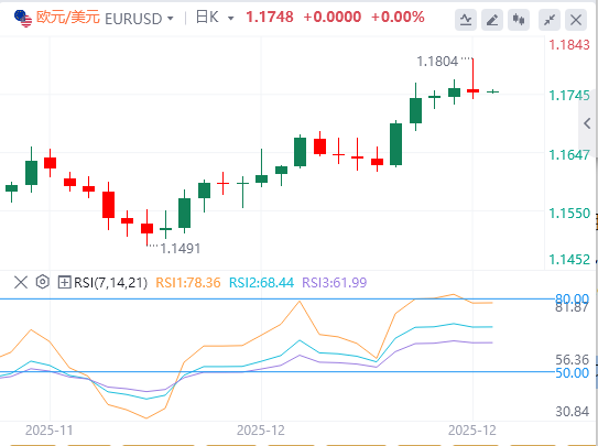 美元指数:截至发稿,美元徘徊在98.21附近。美元在本年度最后阶段开局表现略显疲软,延续上周跌势。此前美联储释放进一步降息信号,同时市场愈发认为,若全球经济持续企稳,其他经济体的央行或将开启加息周期。技术面上,美元指数正试图在支撑位98.00-98.15下方收稳。如果这次尝试成功,美元指数将向下一个支撑位移动,该支撑位位于97.35至97.50区间。5至97.50方向移动。