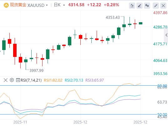 技术面:只要日均收盘价在4300美元以上,黄金价格上涨趋势将保持不变。看涨动能稳定,由相对强弱指数(RSI)所体现,尽管接近超买状态,但最终走平。要实现多头延续,黄金必须突破12月12日4,353美元高点。若突破后者,将揭露历史最高点(ATH)为4,381美元,随后是4,400美元、4,450美元和4,500美元。相反,若价格跌破4300美元,将有望试探12月11日的高点4285美元,随后在4250美元处出现进一步下跌,随后跌至4200美元。