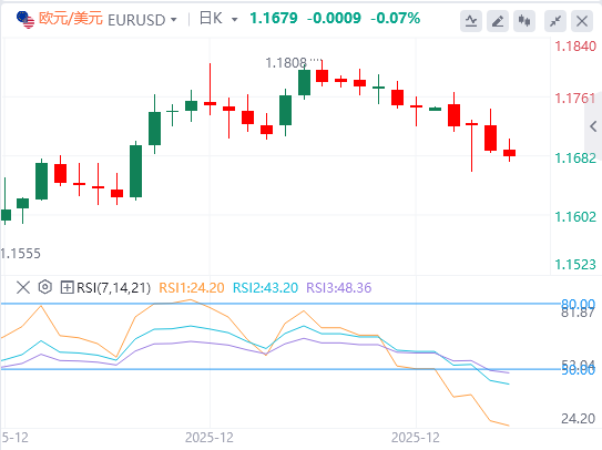 尽管德国周二数据显示,12月CPI年率从11月的2.3%降至1.8%,但欧元在美洲时段仍面临抛压,日内下跌近0.3%。该货币对在1.1700下方的窄幅区间内波动。市场预计欧元区12月调和CPI年率为2%。
