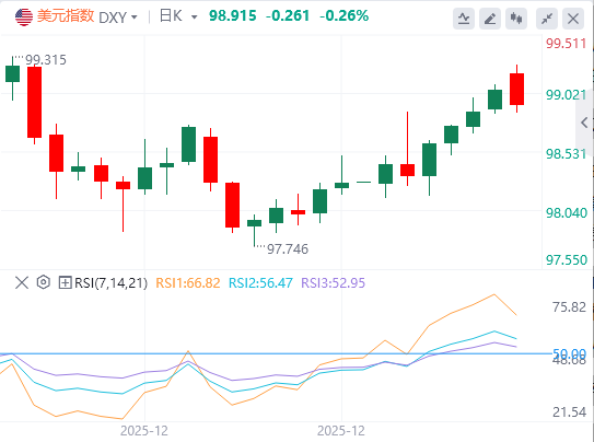 上周五,最新公布的美国失业率低于前值和预期,增加了美联储本月维持利率不变的概率,美元指数重回99整数关口上方,创近一个月新高,截至目前,美元报价98.91。