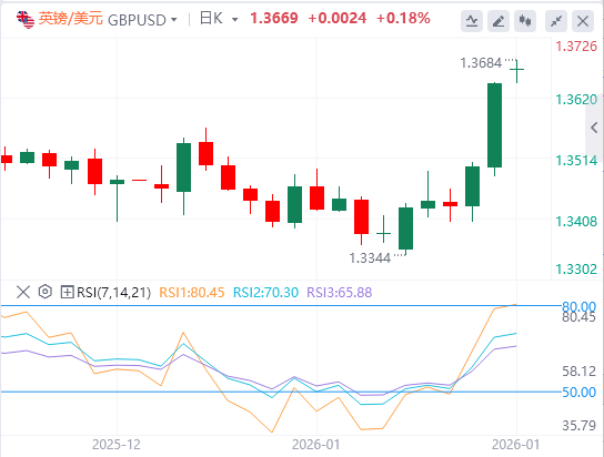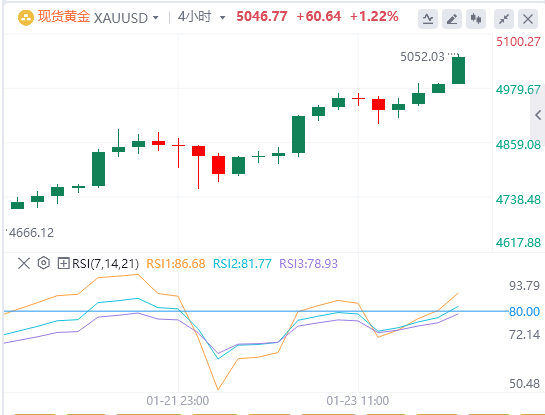 技术面:日线相对强弱指数(RSI)已升至80附近,黄金价格突破了运行约两个月的上升通道上轨,显示市场处于极度超买状态。因此,在趋势延续之前,金价不排除出现技术性修正。若金价有效突破5000美元,市场可能转向关注5100、5200、5300等整数关口附近的获利了结目标区域。