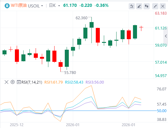 技术面:WTI原油整体仍处于震荡偏弱的下行结构之中,短期反弹更多体现为技术性修复,而非趋势性反转。日线图显示,油价持续运行在主要均线系统下方,中短期均线呈现空头排列,价格重心不断下移,反映市场做多动能不足,空头仍占据主导。从关键价位观察,60美元整数关口已由前期重要支撑转化为明显阻力位。油价多次反弹至该区域附近均受阻回落,显示该位置卖压较为集中。若WTI无法有效站稳60美元上方,反弹空间将持续受限。进一步向上看,62美元附近汇聚前期密集成交区及多条均线,对油价构成更强的技术阻力,在缺乏基本面利多配合的情况下,突破难度较大。下方支撑方面,58.50美元构成短线关键防守区域,一旦该位置失守,油价可能加速下探至57美元关口,甚至不排除再次测试前期低点区间。