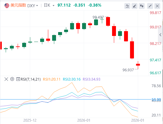 上周五,因地缘政治紧张局势令投资者不安,美元指数全日下行,截至目前,美元报价97.11。