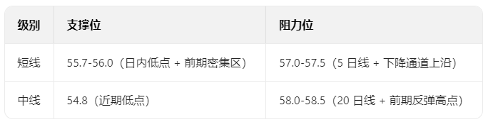 操作:反弹至57.0-57.5做空,止损58.0,目标56.0-55.5;若跌破55.5,进一步看54.8,企稳可轻仓试多,止损54.5,目标56.5。