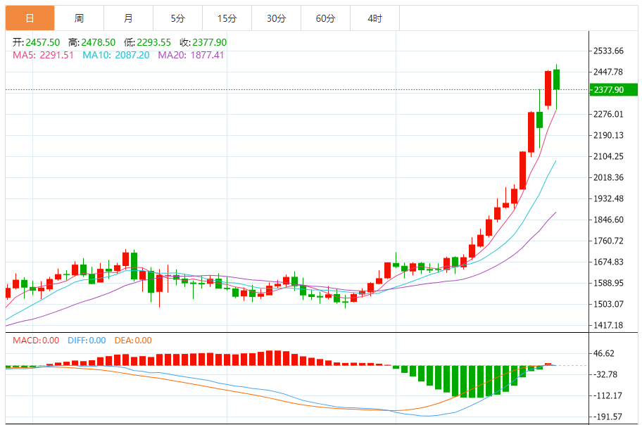 从形态结构看,白银处于多头浪节奏当中,周五大阳线暴涨创历史新高,早盘跳空高开逼空上行,由于情绪过于亢奋,多头获利盘出逃,导致早盘白银价格暴跌,形成剧烈大阴线k线信号,表明空头开始发力,后市多头熄火,行情将处于高位震荡回落节奏。综合MACD指标看,快慢线0轴上方运行,表明多头力量主导行情,但红色动能柱缩短,表明多头动能减弱了。策略上建议冲高找压力位埋伏空单思路为主。