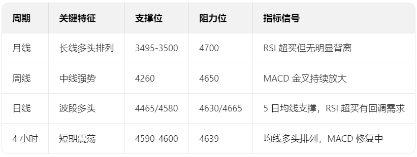 短期(1-3日):预计在4580-4640区间震荡,关注晚间美国零售销售、PPI数据及美联储官员讲话影响。回调至4580-4600区间可视为低吸机会,若跌破4575则需警惕进一步调整风险。