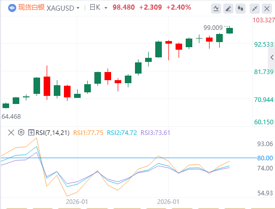 上个交易日银价大幅度上行,破前高95.85一线,当前亚盘时段多头继续拉涨,整体的交易重心持续的上行。均线系统上,当前价格仍然高于60均线及100均线,均线维持双双发散向上,表明当下的看涨之势不变。操作上,依托下方的支撑,尝试逢低做多的操作思路,关注支撑位97.80一线,如若在此震荡企稳,可考虑布局多单,上行关注100.00一线的整数关口的压力,若上破,则多头进一步测试101.50附近的压力。