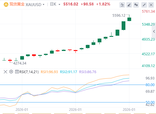 近期金价上涨后在高位维持震荡,但随着美联储利率决议及鲍威尔讲话的影响,金价延续强势,一度逼近5600.0美元每盎司,本轮行情的强势逐步进入疯狂阶段。均线多头发散,布林带扩张且开口向上,显示强势多头占主导。同时CCI指标在超买区间下方拐头向上,显示多头在保持强势的同时以震代调,仍有机会上行。操作上可关注逢低做多的机会。