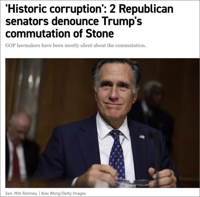 据美国政治新闻网站报道,共和党籍参议员罗姆尼11日在推特上说,特朗普的决定是“史无前例的、历史性的腐败:一位美国总统给一名被陪审团判定为撒谎以保护总统的人减刑”。