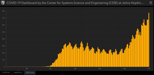 据约翰斯·霍普金斯大学监控数据显示,美国7月16日报告过去24小时新增病例逾7.74万例,刷新单日新增病例纪录,累计确诊357.6万例,死亡13.8万人。