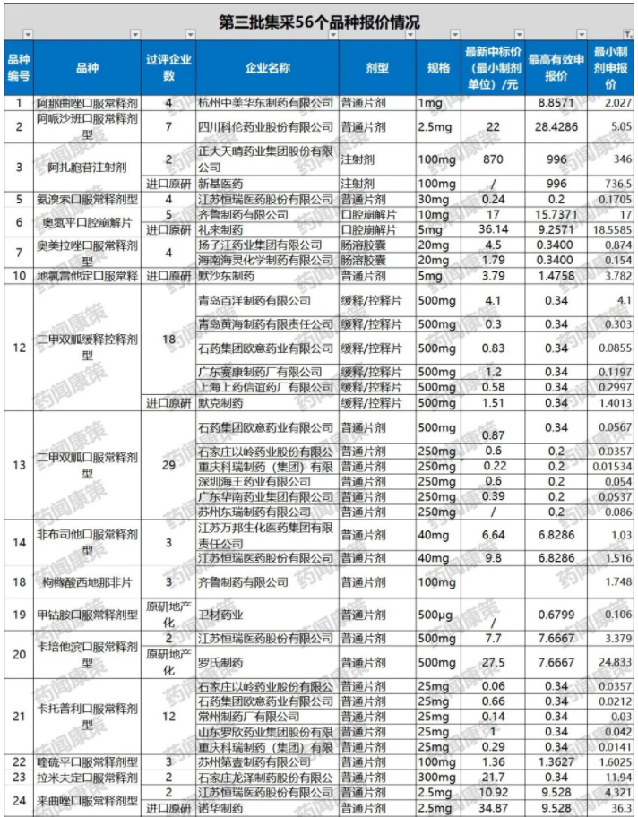 第三批集采一共涉及56个品种。最让业界惊叹的是西地那非的报价,25mg报出1.748元。糖尿病用药二甲双胍降价超90%,重庆科瑞制药的二甲双胍报价1.29元/84片,有人士调侃:可以按筐买了。