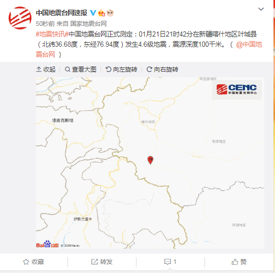 中国地震台网正式测定:01月21日21时42分在新疆喀什地区叶城县(北纬36.68度,东经76.94度)发生4.6级地震,震源深度100千米。