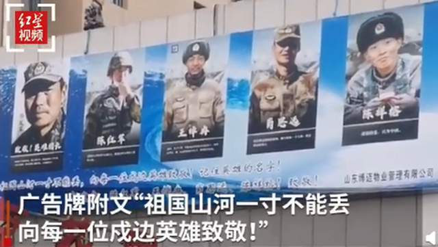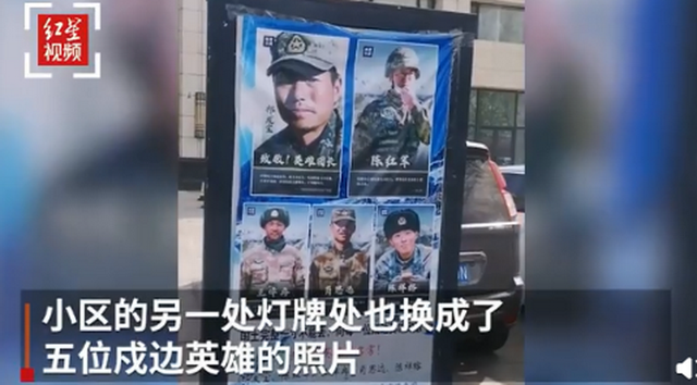 3月10日,山东菏泽一小区的物业公司撤下明星广告牌,换成了5位戍边英雄的照片,附文令人泪目:“祖国山河一寸不能丢,向每一位戍边英雄致敬!记住英雄的名字!祁发宝、陈红军、王焯冉、肖思远、陈祥榕!致敬!”小区业主纷纷点赞,表示支持。