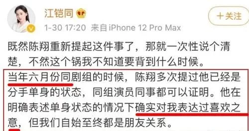 同样是30日,江铠同不担骂名卖队友。她发文表示,陈翔方早在6月份的时候就表达喜欢与单身。自己没答应,白白承担了骂名这么多年。