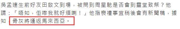 吴孟达的好友田启文随后到场,他再度被问到周星驰会否来到灵堂送别,回应称,“不知道。”并表示丧礼事宜稍后会有新闻稿,据悉,吴孟达的骨灰将运回马来西亚。