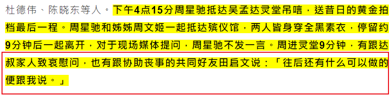 对于媒体提问周星驰一言不发,但进入灵堂9分钟后,他有与达叔的家人致哀慰问,还跟共同好友田启文表示:“往后还有什么可以做的便跟我说。”