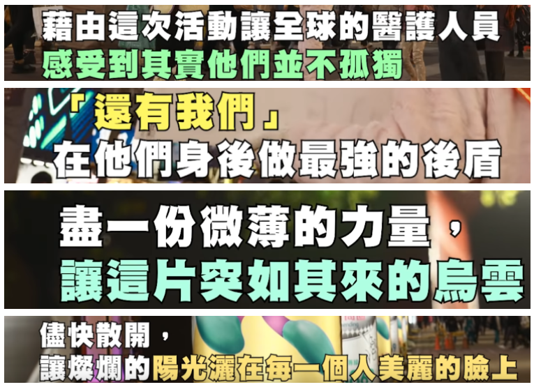 影片的字母写道:借由这次活动让全球的医护人员,感受到其实他们并不孤单,还有我们在他们身后做最强的后盾。在世界各地,还有一些人正在对抗病毒, 希望每一个人尽一份微薄的力量,让这片突如其来的乌云尽快散开,让璀璨的阳光洒在每一个人美丽的脸上。
