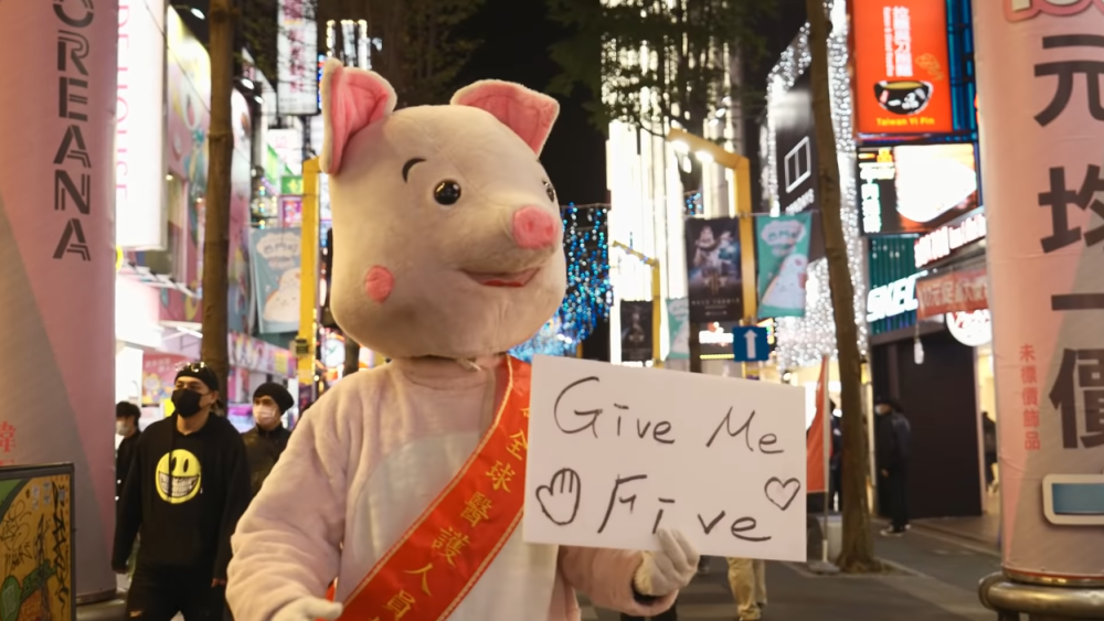 本期视频的主题是为全球医护人员加油。视频中罗志祥穿上粉红猪造型布偶装,挂上写有“为全球医护人员加油”的红丝带,手里拿着写有“Give me five”的白色牌子,站在步行街的路口和随机路过的路人击掌。