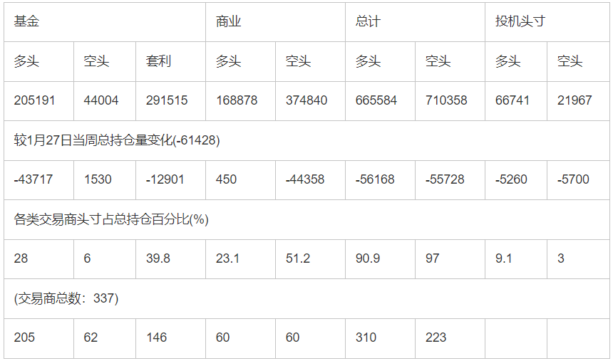 截止2月3日当周COX(纽约商品期货交易所)黄金期货和期权分类持仓报告: 合约单位:(100金衡盎司的合同)总持仓量:732325