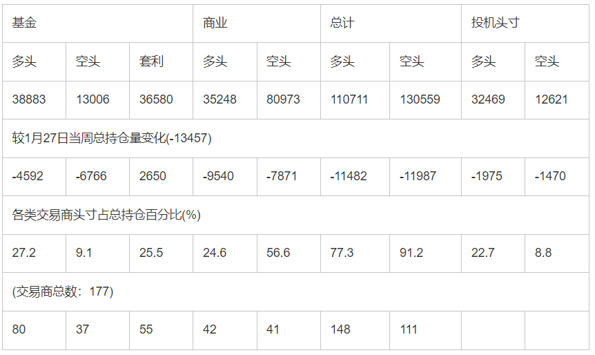 截止2月3日当周COX(纽约商品期货交易所)白银期货分类持仓报告: 合约单位:(5000金衡盎司的合同)总持仓量:143180