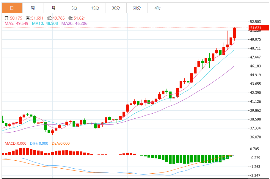 周一(10月13日),现货白银目前位于51.619美元/盎司附近,涨幅为2.73%。