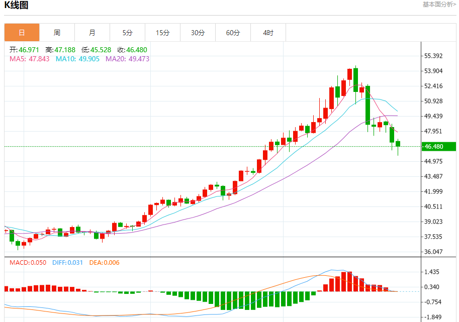周二盘中,现货白银报46.470,跌幅0.87%。