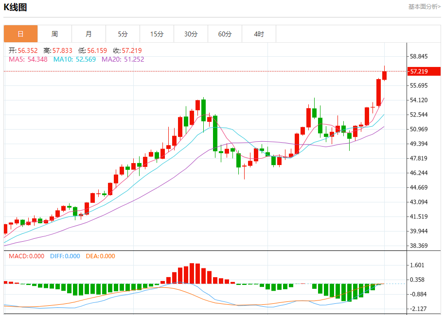 周一盘中,现货白银报57.156,涨幅1.38%。