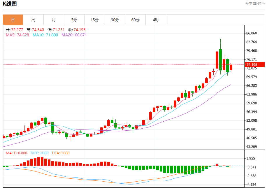 从最新的技术指标观察,白银短期走势呈现强势上攻姿态,但部分指标暗示市场已进入关键区域,需警惕技术性调整。技术图显示,价格当前已运行至布林带(BB 20,2)中轨73.661美元上方,并向上轨77.078美元方向测试。布林带开口向上扩张,显示短期上涨动能充沛。然而,MACD(26,12,9)指标呈现微妙信号:DIFF值为0.237,DEA值为0.374,柱状线为负(-0.276)。这通常意味着尽管价格在上涨,但上涨的动能(DIFF)尚未超越平均动能(DEA),市场可能存在短期内的动能背离或整理需求。RSI 14 读数位于53.664,处于中性偏强区域,尚未进入超买,为后续上行。