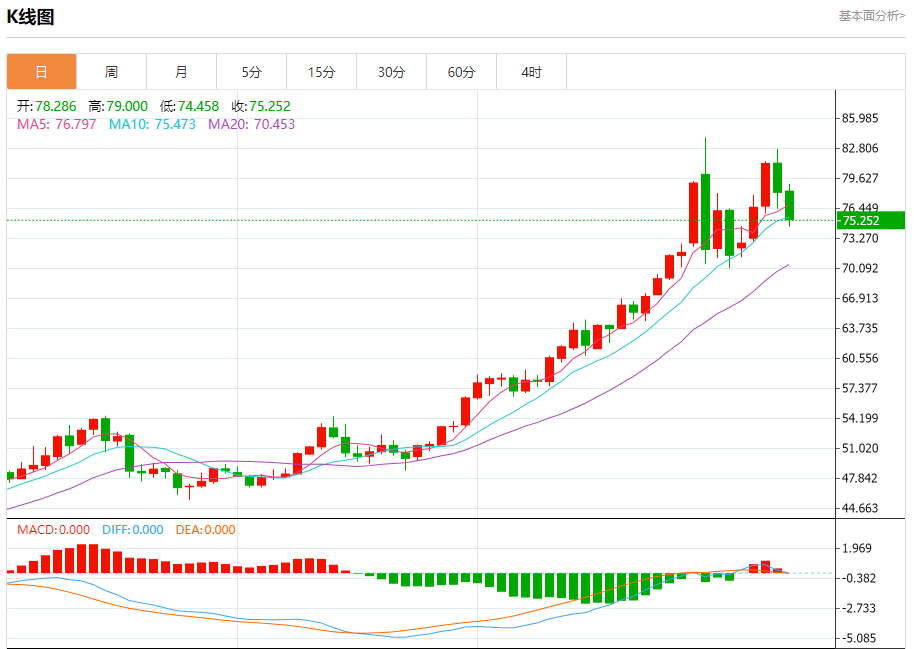 周四盘中,现货白银报75.220,跌幅3.75%。