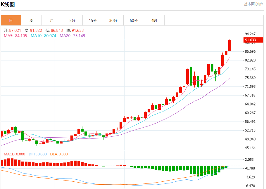 周三盘中,现货白银报91.695,涨幅5.50%。