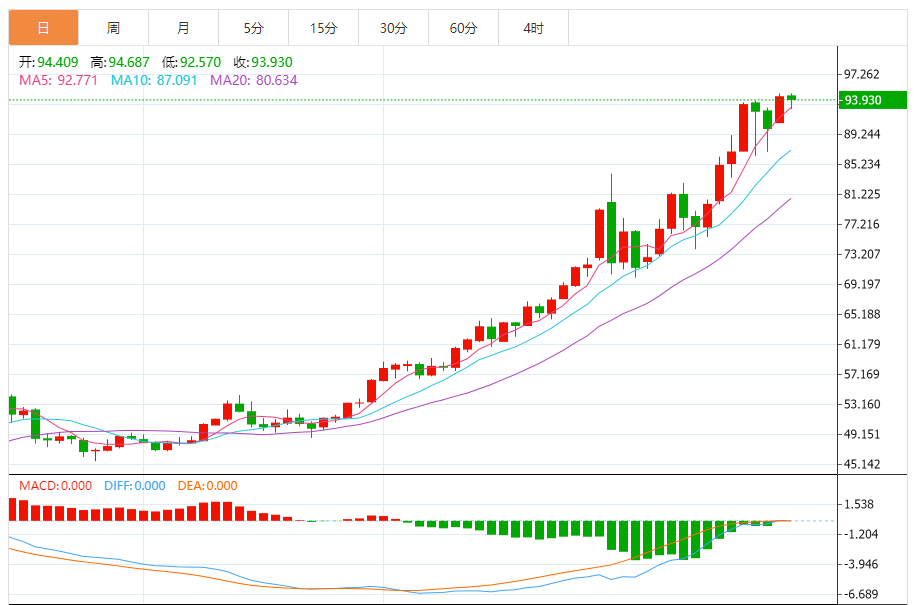 周二(1月20日),现货白银目前位于93.904美元/盎司附近,跌幅为0.40%。