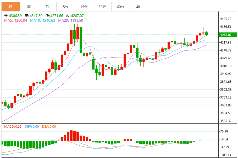周二(12月16日),现货黄金目前位于4287.08美元/盎司附近,跌幅为0.41%。