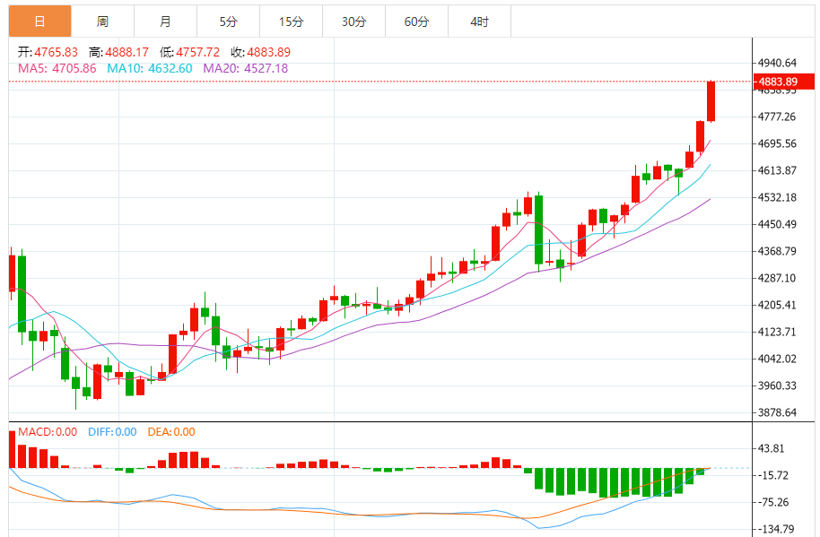 周三(1月21日),现货黄金目前位于4886.03美元/盎司附近,涨幅为2.58%。