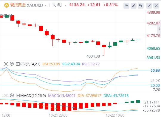 10月22日,周三欧洲早盘交易时段,金价回升至4,150美元附近。由于对美国政府关门影响的担忧以及对全球政府债务不可持续的持续担忧,贵金属走高。