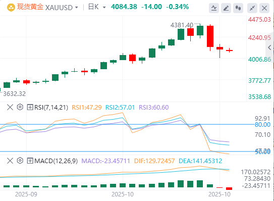 值得关注的直接阻力位是4,140美元,即10月15日的高点。如果买家介入,黄金可能会引发新的看涨势头,升至10月16日的高点4,330美元。下一个障碍出现在布林带4,365美元的上限。