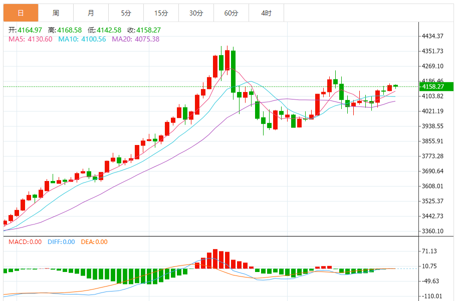 周四盘中,现货黄金报4158.23,跌幅0.15%。