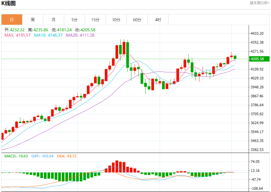周二盘中,现货黄金报4205.58,跌幅0.63%。