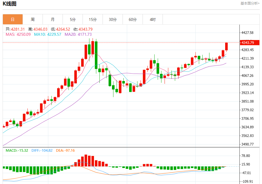 周五盘中,现货黄金报4343.51,涨幅1.49%。