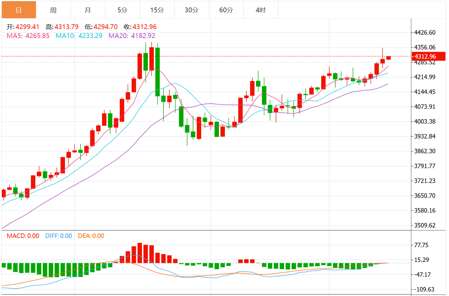 日线图方面,20日均线已上穿100日和200日均线,强化中期多头结构。尽管技术指标进入超买区域,短期不排除出现整理或技术性回调,但在4250美元上方企稳的情况下,市场仍有望再次测试历史高点,甚至向4380美元及更高区域推进。