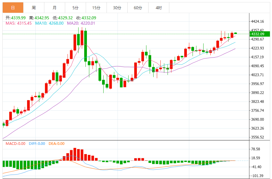 日线级别仍维持完好的上升结构。自12月初金价突破4200美元关键关口后,已形成“阶梯式”上涨形态,每次回调均未跌破前低,且成交量同步放大,确认上涨动能的有效性。当前金价站稳5日、10日、20日均线之上,均线系统呈多头排列,其中5日均线4322美元成为日内重要支撑。不过日线级别MACD虽维持金叉,但KDJ指标已出现高位拐头迹象,提示短期需警惕获利回吐压力。
