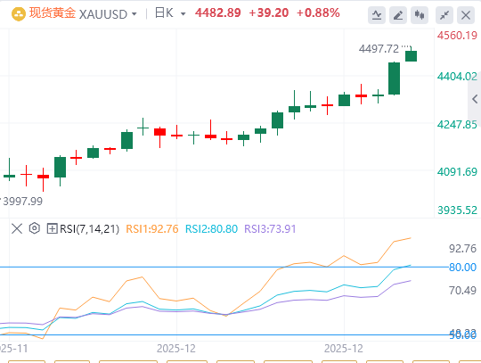 突破4375-4380的阻力位(之前的历史高点)并随后突破4400的举动被视为黄金多头的新触发点。50日简单移动平均线(SMA)稳步上升,进一步强调了坚实的上升趋势。价格保持在SMA之上,目前约在4160区域,这应作为动态支撑。移动平均收敛/发散(MACD)线延伸至信号线之上,并处于正区域,表明看涨动能在增强。然而,相对强弱指数(RSI)处于81(超买),这可能会限制涨幅并促使短期内的暂停。