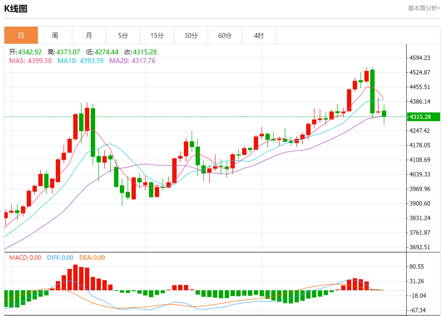 周三盘中,现货黄金报4315.11,跌幅0.54%。