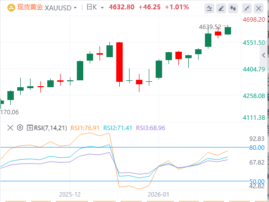 直接阻力出现在上升楔形上界附近的历史高点,约4650美元。若突破该汇合阻力区,黄金将目标4650美元。下行方面,初始支撑位于九日均线4,520.01美元,紧接着是约4,470.00美元的下行楔形边界。